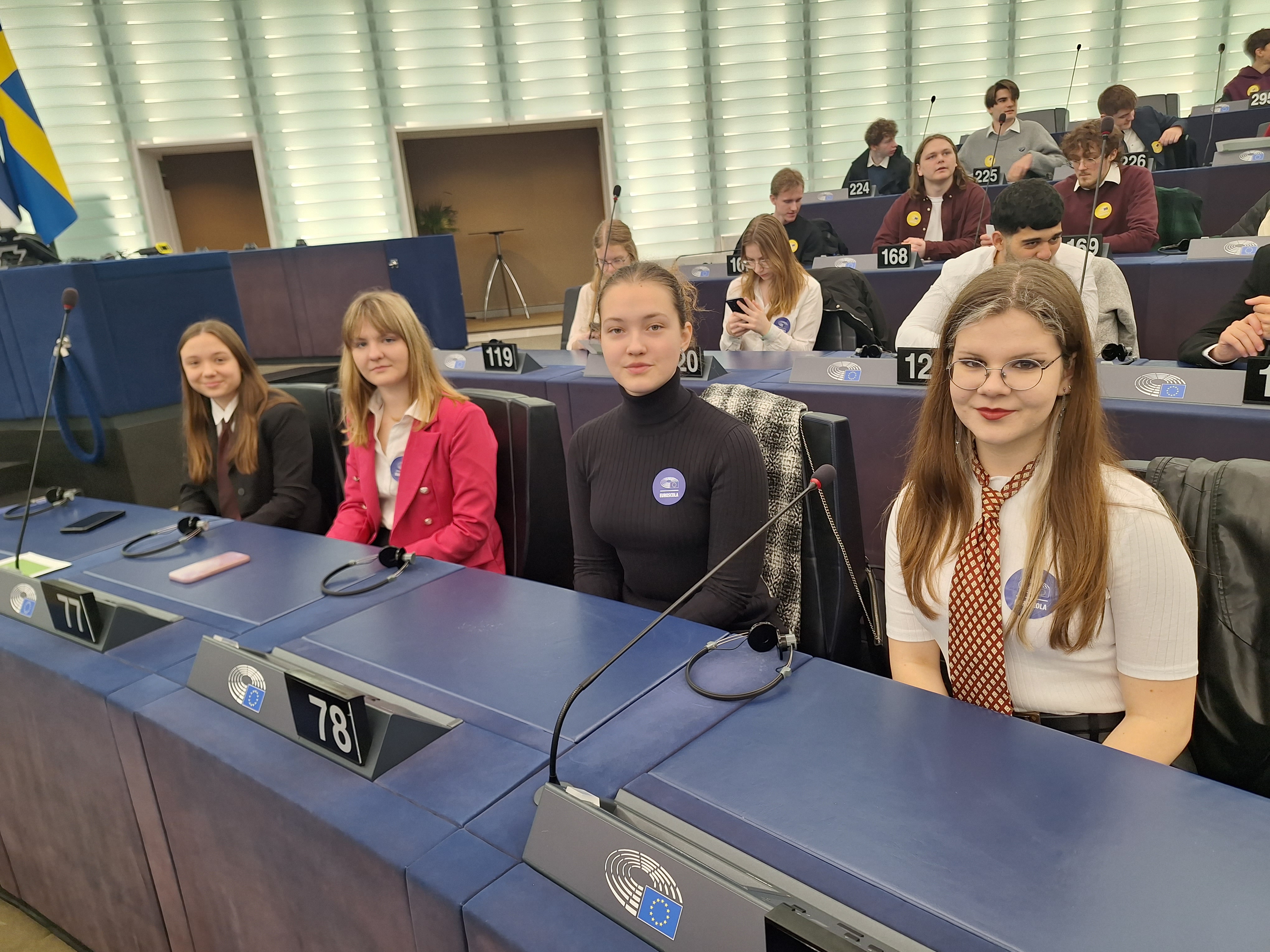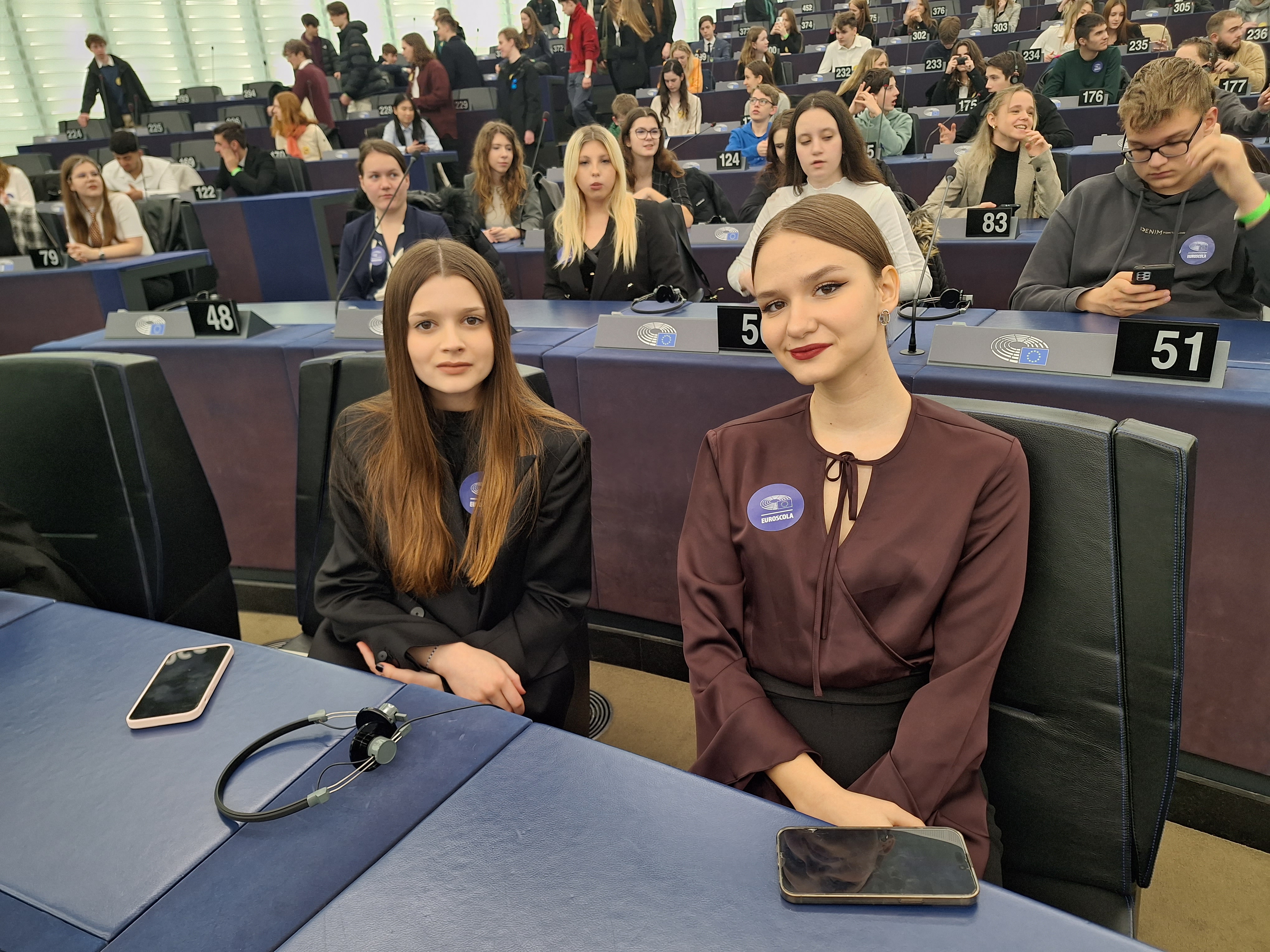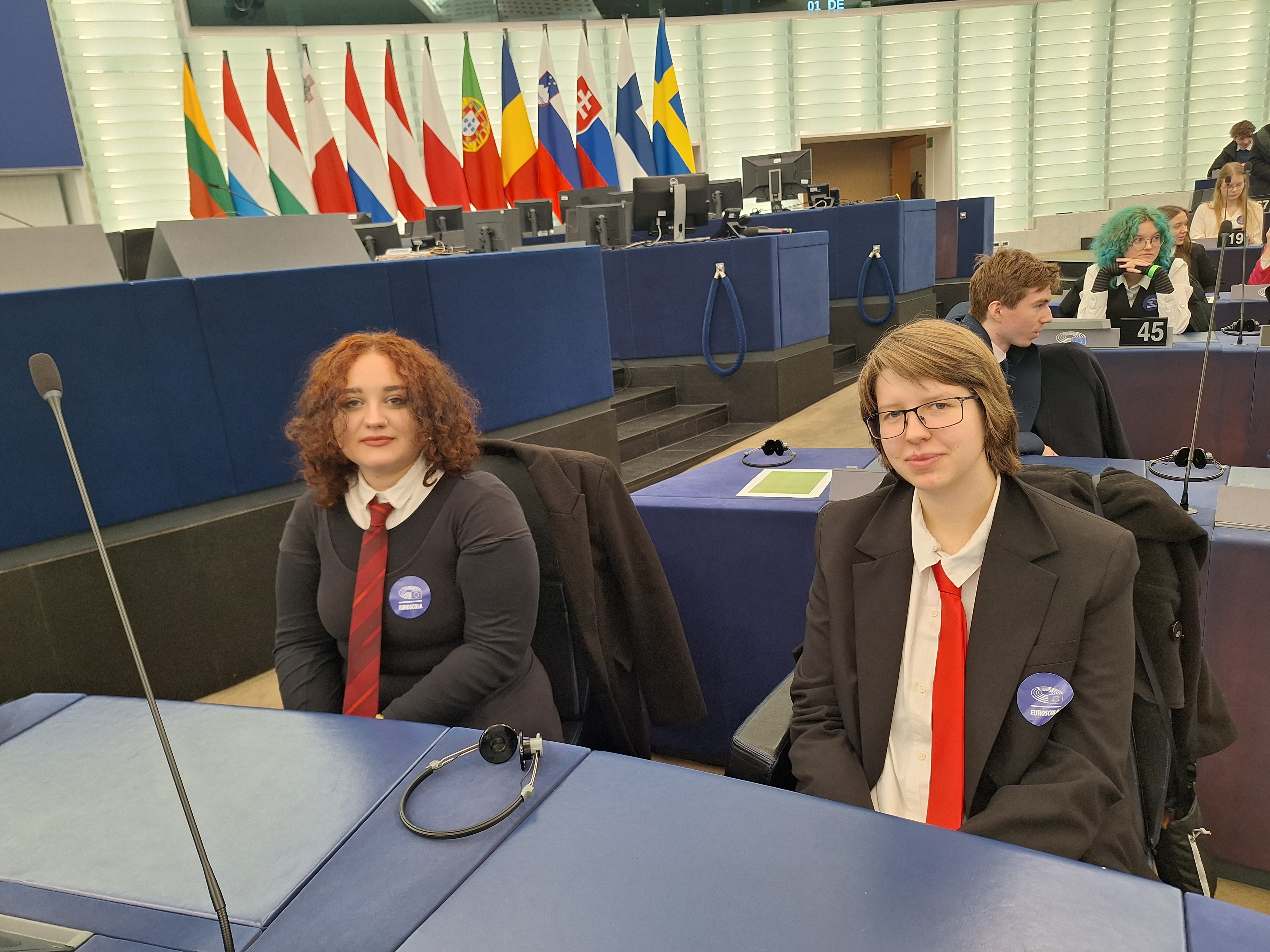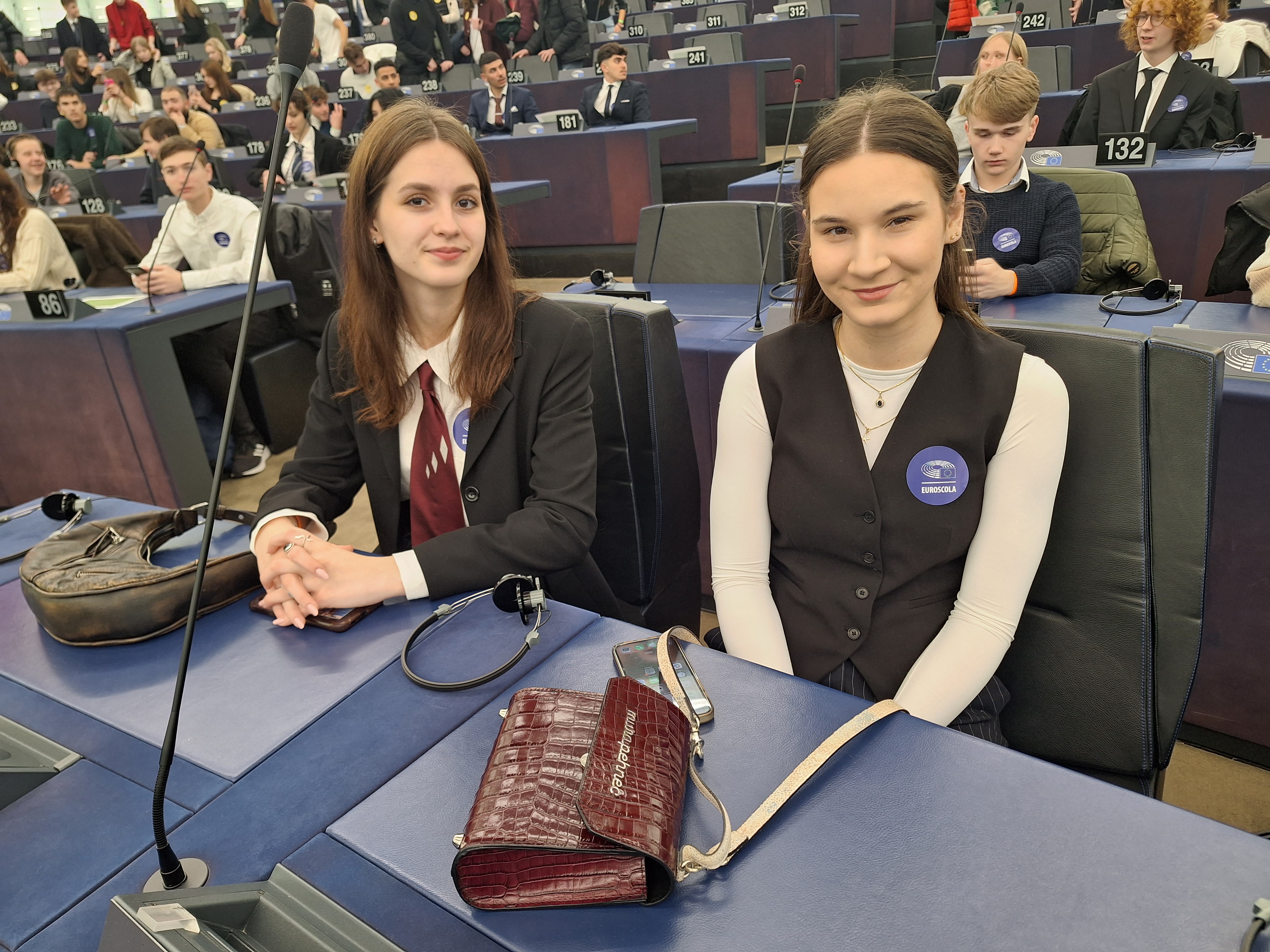 Next morning, we were woken up really early by our alarm clocks. We ironed our shirts, combed our hair and shined our shoes. Everything for the European Parliament! When we arrived at the Louise Weiss building, we were first taken to breakfast. Right after that, we were taken to the Hemicycle, where European politicians work and vote. Firstly, we watched a video message by Roberta Metsola, President of the European Parliament. In the video, it was perfectly explained what people do in the Hemicycle and how it works.
